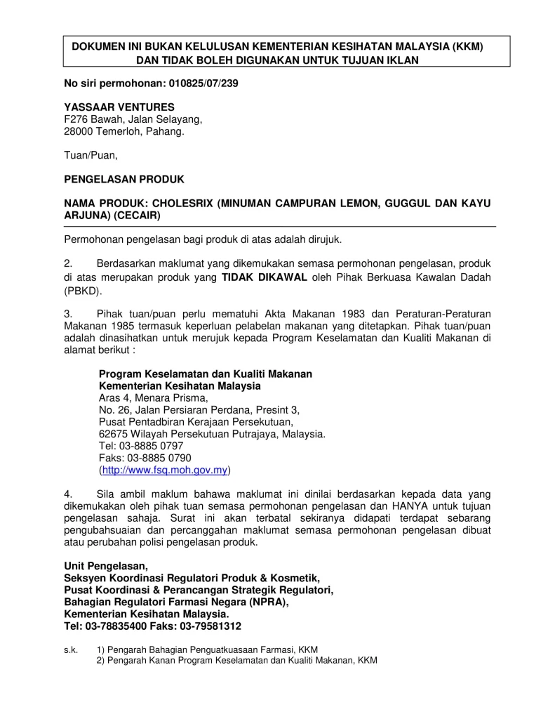 Ya, Cholesrix dikilangkan di fasiliti bertaraf GMP dan mengikuti piawaian keselamatan makanan. Produk ini juga sedang melalui proses pendaftaran dengan KKM (jika berkenaan).