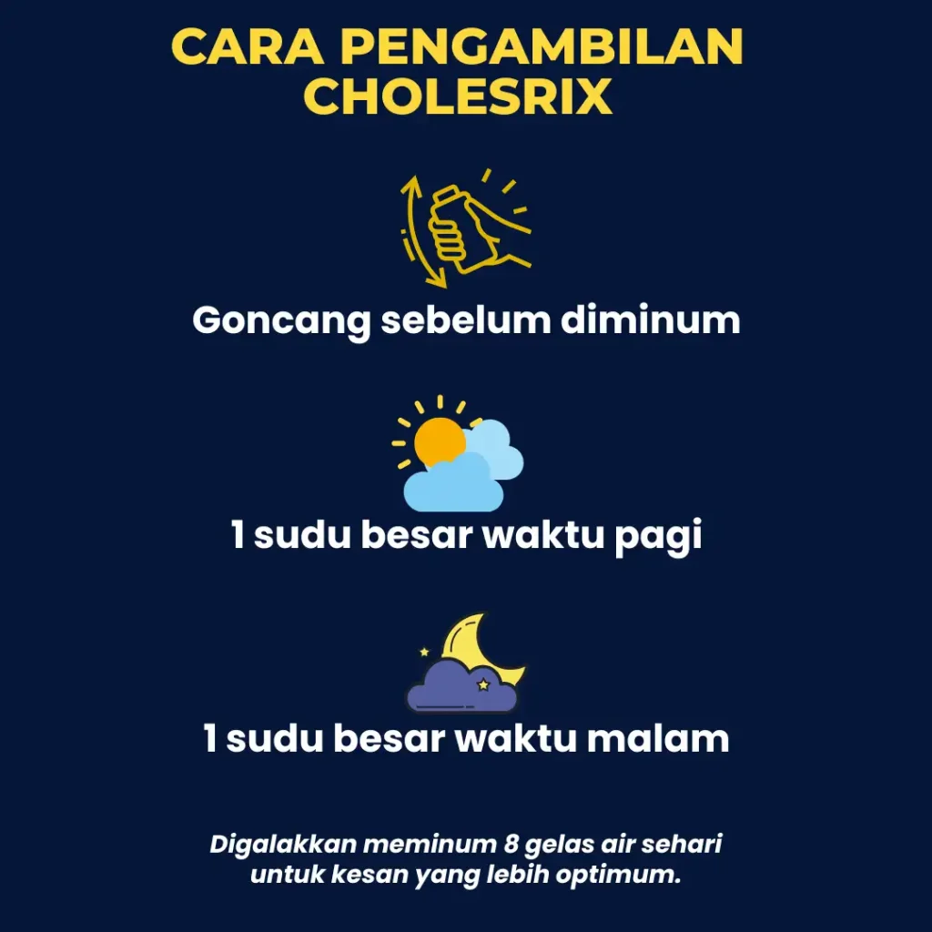 Kami sarankan untuk mengurangkan makanan tinggi lemak tepu dan gula, serta minum air secukupnya agar keberkesanan Cholesrix lebih optimum.